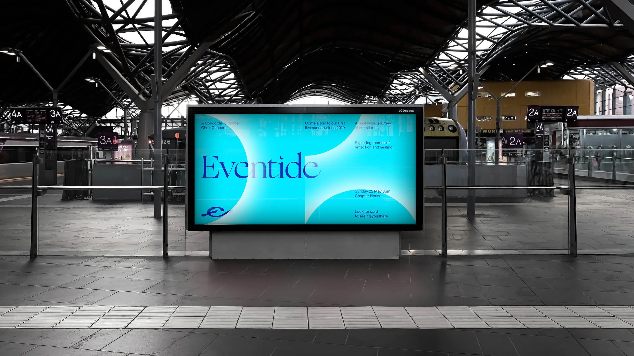 ‘Eventide’ was chosen as the name for the concert reinforcing these reflective themes. A tidal pattern was created for each song using graphic devices relating to water, ocean and the moon and constructed to represent the nature of each song. These patterns were used in both static and animated form throughout the identity. Printed programs featured each pattern which was then projected above the choir during the concert.